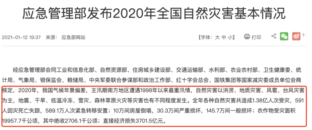 我國有1.38億人次受災,農作物受災面積19957.7千公頃,其中絕收2706.1千公頃。