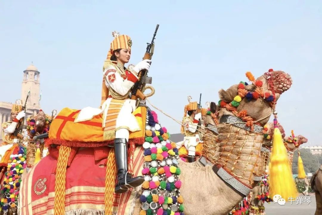 讓人眼前一亮的,還有印度的駱駝部隊,駱駝裝飾得比姑娘還漂亮,當然,騎在駱駝上的印度姑娘更漂亮。