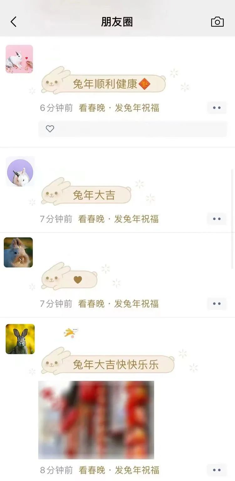 加拿大當地時間早上7點,吳丹在羣消息轟炸的中被吵醒,她打開微信朋友圈,被一個個小兔子的對話框刷屏。“原來是春晚開始啦!”她趕緊跟風發了一條。