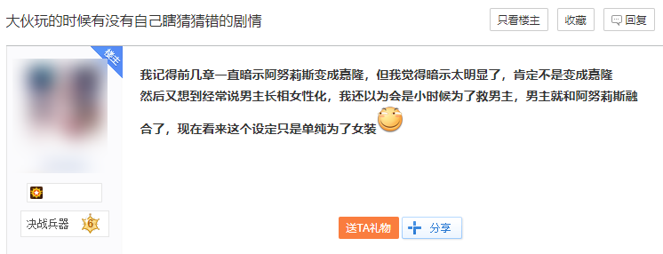 就比如故事前幾章的故事,涉及到各種人物身份轉變,幾乎一半的玩家都會不自主地去猜測“ 誰是誰 ”,也幾乎一半都猜錯了。