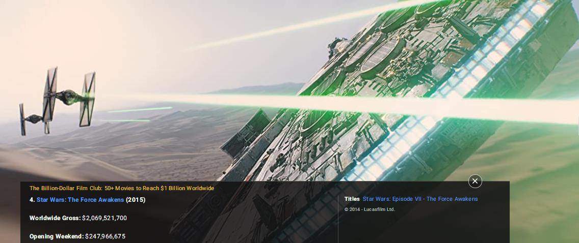 4、星球大戰7:原力覺醒Star Wars: The Force Awakens(2015) 全球票房: $2,069,521,700