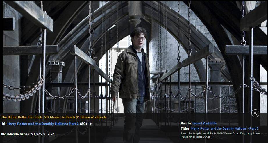 16、哈利波特與死亡聖器:第 2 部分Harry Potter and the Deathly Hallows Part 2(2011) 全球票房: $1,342,359,942