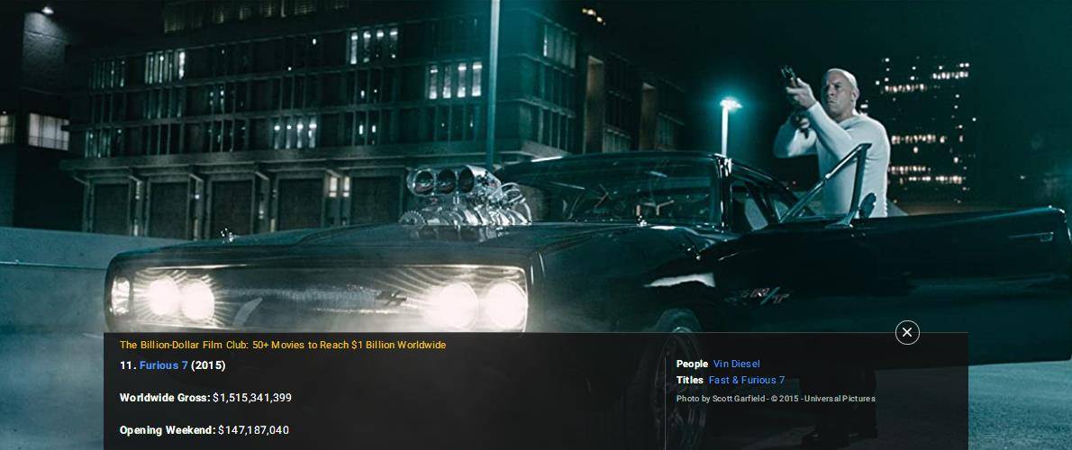 11、速度與激情7Furious 7(狂暴7)(2015) 全球票房: $1,515,341,399