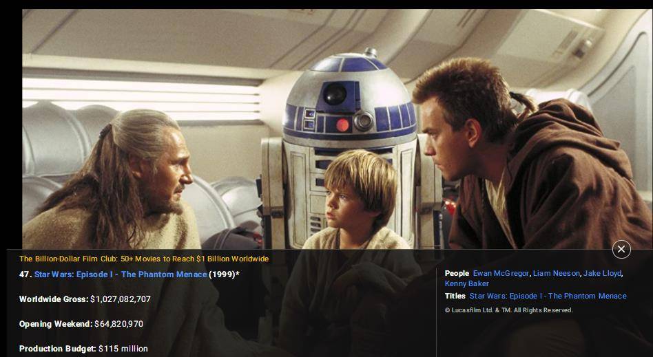 47、星球大戰前傳 I - 魅影威脅(1999)Star Wars: Episode I - The Phantom Menace 全球票房: $1,027,082,707