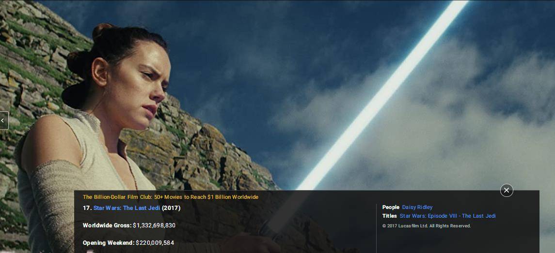 17、星球大戰8 - 最後的絕地武士Star Wars: The Last Jedi(2017) 全球票房: $1,332,698,830