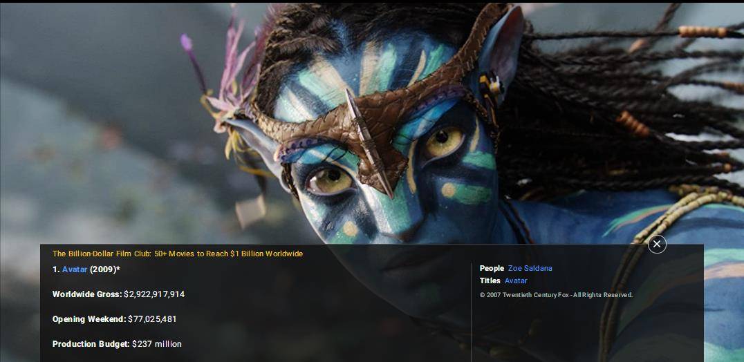 《阿凡達》,上一個統計年度總票房為27億美元,本年度為29億美元。也就是説自2009年上映以來票房增加了近2億美元,相當於近13億人民幣。在全球電影票房總榜的排名也從第二名有一次晉升為第一名。