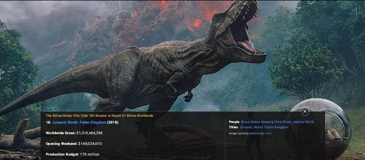 18、朱羅紀世界:墮落王國Jurassic World: Fallen Kingdom(2018) 全球票房: $1,310,466,296