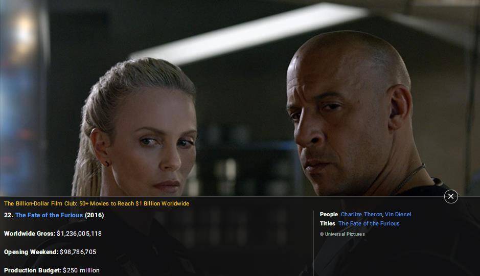 22、憤怒的命運The Fate of the Furious (2016) 全球票房: $1,236,005,118