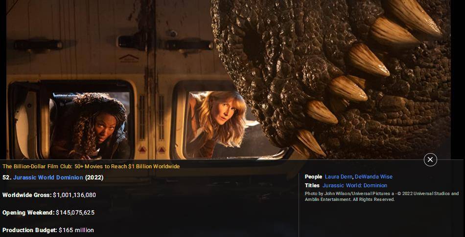 52、侏羅紀世界Jurassic World Dominion (2022) 全球票房: $1,001,136,080