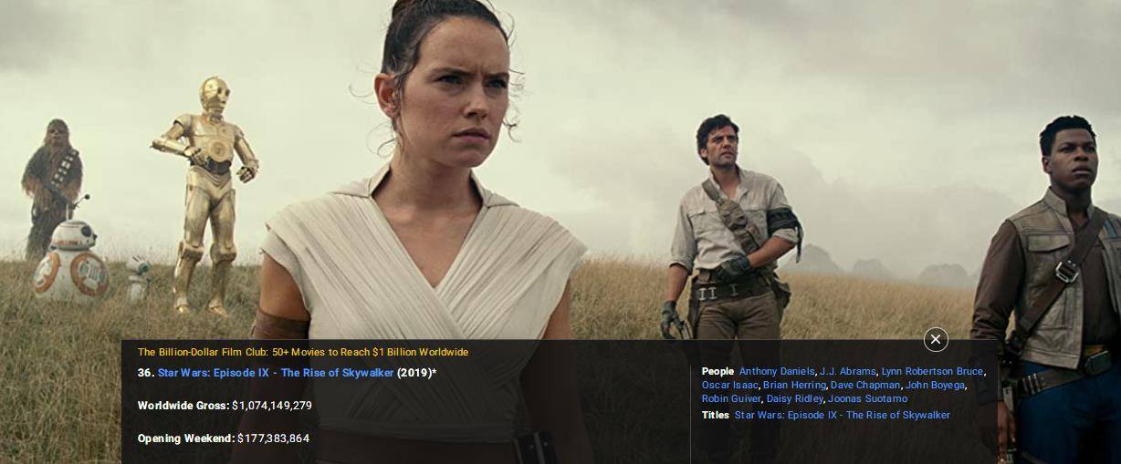 36、星球大戰9 - 天行者的誕生Star Wars: Episode IX - The Rise of Skywalker(2019) 全球票房: $1,074,149,279