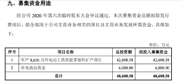 華之傑本次擬投入募集資金額4.86億元,主要募投項目為年產8650萬件電動工具智能零部件擴產項目、補充流動資金。本次公開發行不超過2500.00萬股,不低於發行後總股本的25%。