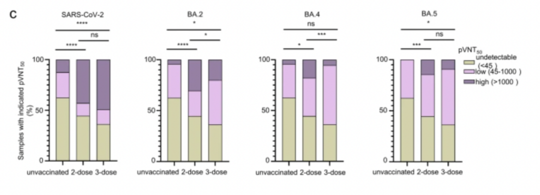 繪製的中和抗體滴度結果類似,三劑疫苗組中針對原始毒株的中和抗體滴度略高於兩劑疫苗組,但針對BA.2、BA.4和BA.5的中和抗體滴度卻顯著下降。