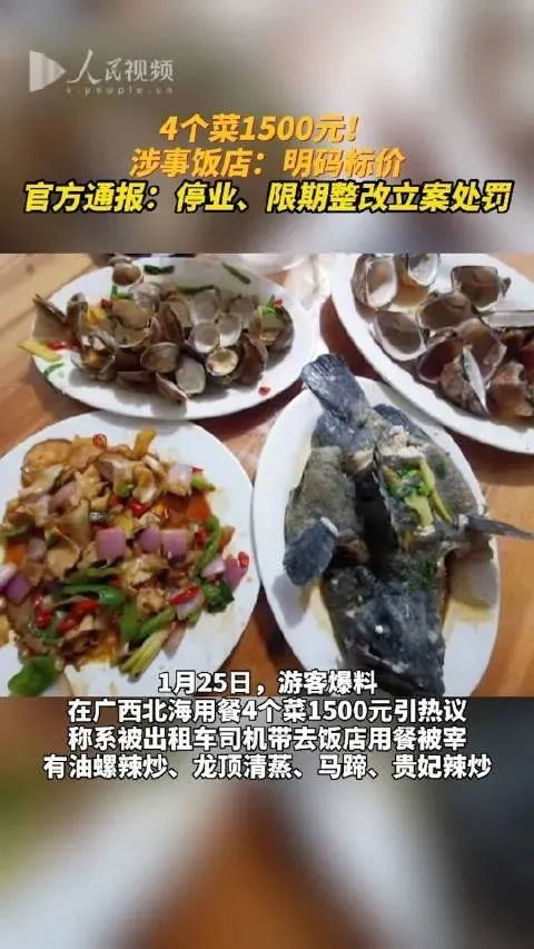 1月25日,抖音一網民發佈視頻,並配文稱在北海就餐消費時被宰,“4個菜1500塊”!