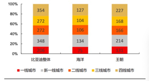 比亞迪一向注重對低線城市的佈局。根據長江證券在2022年6月份的一份報告,比亞迪在四線城市的店面數量佔比,約為25%。