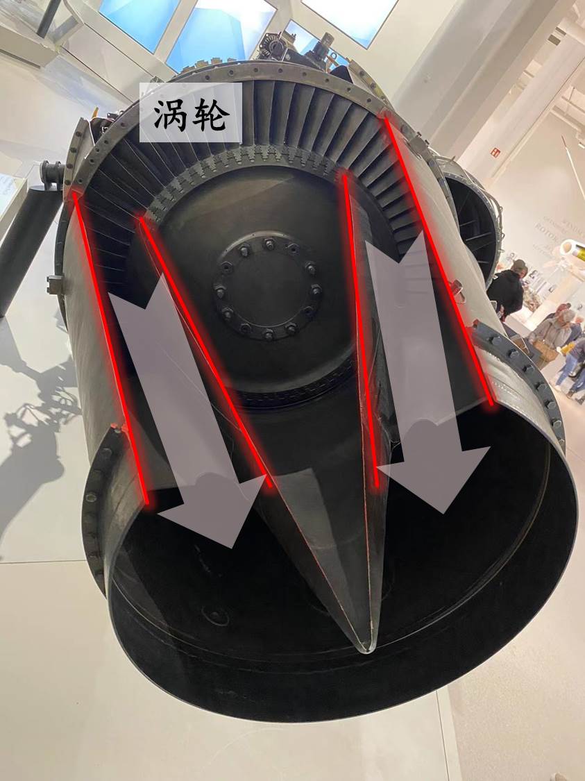 在渦輪中,高温高壓的燃氣膨脹加速,把一部分氣體內能轉化為渦輪轉子的旋轉動能,通過軸為壓氣機轉子提供動力。與壓氣機相反,每一級渦輪由前方的靜葉(導向葉片)和後方的動葉(工作葉片)構成。