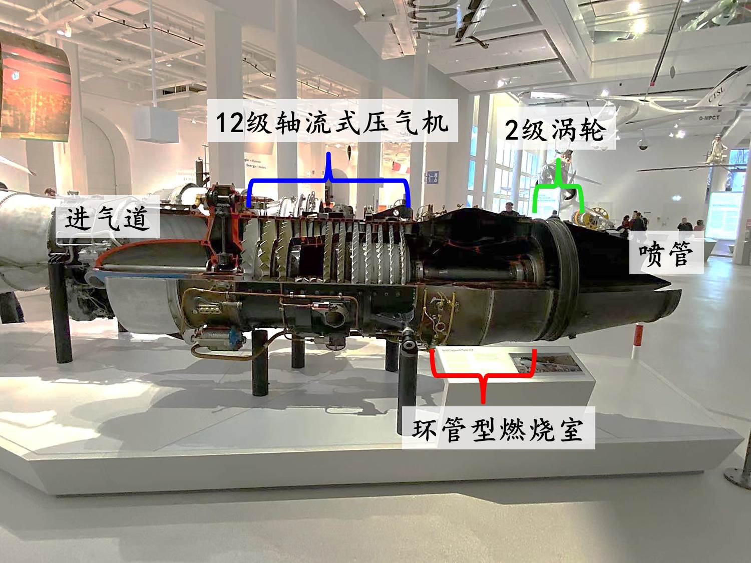 位於慕尼黑的德意志博物館以部分解剖的形態展出了一台皮爾納014型發動機。它是該型發動機A0版本的V05號原型機,曾被用於地面試驗,後被德累斯頓工業大學作為教學道具。這個展品非常清晰地展示了渦輪噴氣(渦噴)發動機的內部結構,那就以它為例,解説一下渦噴的工作原理吧。