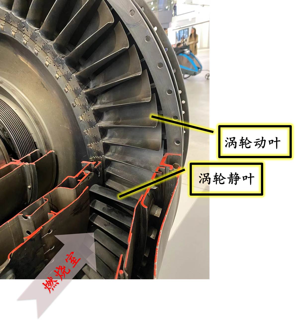 在燃燒室內,燃油燃燒產生高温,大大增加了氣體所藴含的能量。發生燃燒的地方叫火焰筒。多個(這裏是12個)圓形截面火焰筒呈環形排列,由統一的環形外套包裹,構成環管型燃燒室。