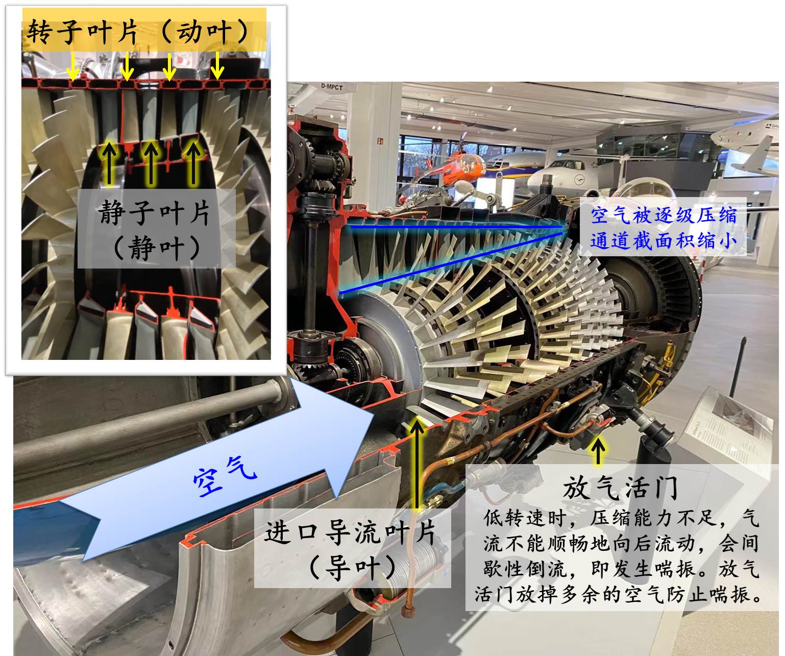 壓氣機負責把吸入的空氣加壓。旋轉的動葉把動能傳遞給空氣,固定在其後方的靜葉負責整流,使空氣減速增壓(動能轉化為壓力勢能)。一套動葉和靜葉的組合構成一級壓氣機。空氣平行於軸向流動,只在圓周方向上加減 速而軸向速度不變,故稱軸流式壓氣機。