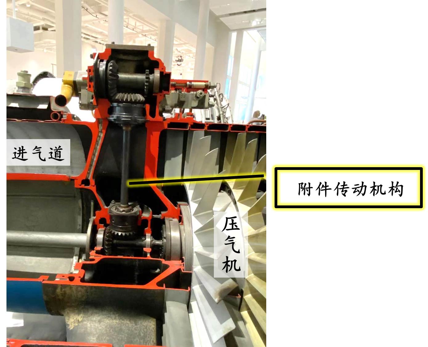 除了驅動壓氣機,還有一小部分來自渦輪的軸功率被用於驅動各種發動機和飛機附件,如發電機、燃油泵、潤滑油泵、液壓油泵等。這台發動機附帶的發電機兼做起動電機(在發動機啓動階段驅動轉子旋轉),所以動力能夠雙向傳遞。