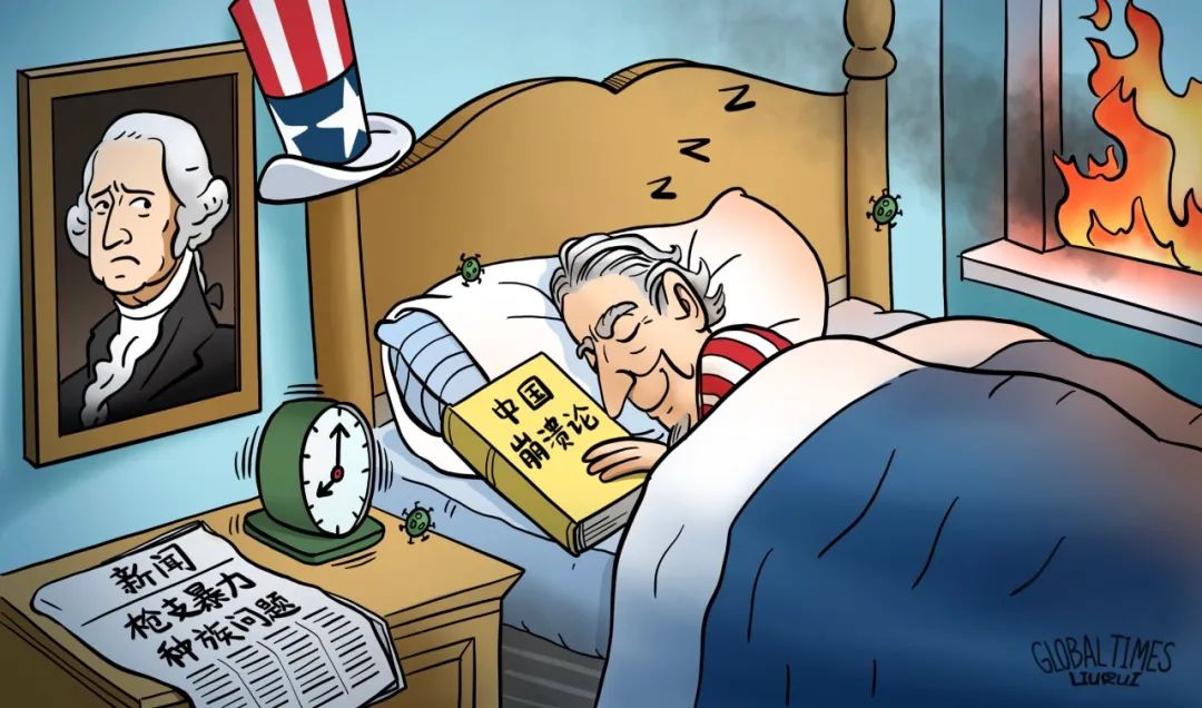 ▲美國一些人罔顧疫情反覆延宕,槍支氾濫、警察暴力執法、種族歧視等問題成堆,卻時刻想着對中國甩鍋推責,鼓譟“中國崩潰論”。(漫畫 | 劉蕊)