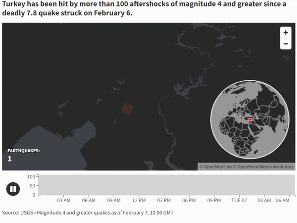 除了短時間的兩次極強地震外,震中周邊伴有大量餘震活動,截至北京時間2023年2月8日2時,共有6.0-6.9級地震3次,5.0-5.9級地震24次(據美國地質勘探局統計)。