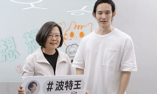 結果,誰也沒想到,本來還和韓國瑜合作為高雄旅遊代言的波特王,在2019年底突然轉綠,跟蔡英文一起拍了一期視頻,用“土味情話”撩蔡英文,並在視頻中稱蔡英文為“台灣總統”。