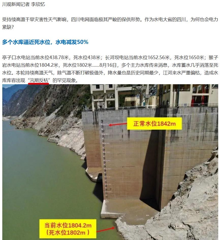 川觀新聞2021年11月發佈的《水電大省,為何也會面臨限電?》講到:
