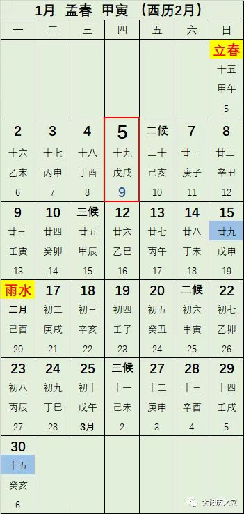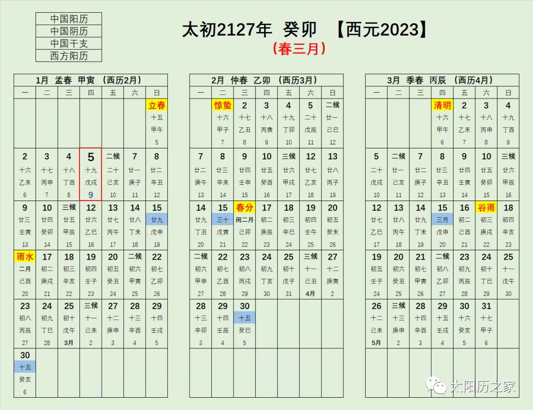 **説明:**最上一行是中國平氣法24節氣太陽曆,最下一行是西方太陽曆(公曆),中間兩行是傳統定氣法正朔干支歷。