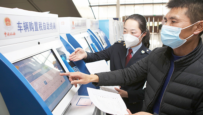2023年1月5日,江西宜春,國家税務總局宜春市税務局第一税務分局業務工作人員輔導市民辦税。圖片來源:人民視覺