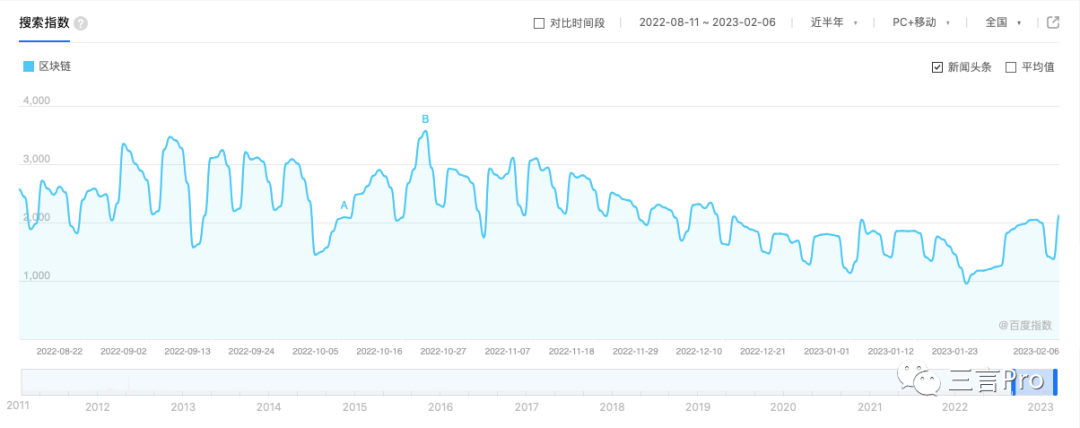 而“區塊鏈”的微信指數,在去年8月底達到頂峯,日指數達到1800多萬。此後也是大幅下降,偶爾出現一個小高峯。不過此次ChatGPT的爆火,卻沒能給“區塊鏈”帶來一波新的增長。