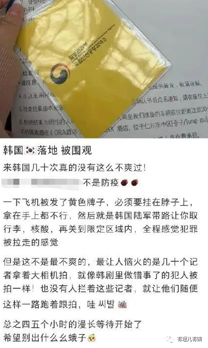 據網友表示,剛抵達韓國時,就被韓國機組人員帶上一個區別身份的黃色牌子,而且必須掛在脖子上。緊接着,韓國軍方會帶着中國遊客取行李,接受一系列檢測。