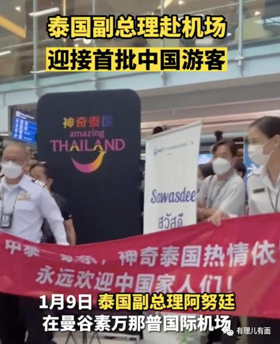 泰國雖然一度對中國遊客開展核酸檢測,但是及時調整政策,並且對中國遊客十分歡迎、重視。比如1月9日下午,269名中國遊客抵達泰國素萬那普機場,泰國副總理兼衞生部長阿努廷、交通部長奇喬布以及旅遊和體育部部長皮帕一同到機場接機,歡迎中國遊客赴泰旅遊。泰媒稱,泰國官方給予本次中國遊客“英雄般的歡迎”。