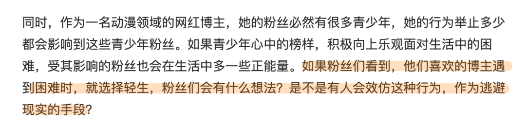 文章後半段,還提到了這件事的影響:作為一名網紅遇到困難時就選擇輕生,粉絲們會怎麼樣,會不會有人效仿。