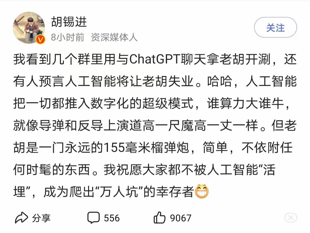 胡錫進對此還做了回應,稱“人工智能把一切都推入數字化的超級模式,誰算力大誰牛,就像導彈與反導上演道高一尺魔高一丈一樣一樣,但老胡是一門永遠的155毫米榴彈炮,簡單,不依附任何時髦的東西。”還説希望大家都不被人工智能“活埋”,成為爬出“萬人坑”的倖存者。