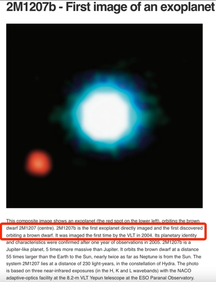 NASA官網顯示,“2M1207b是第一個直接成像(directly imaged)的系外行星。它是在2004年由VLT首次拍攝的。”