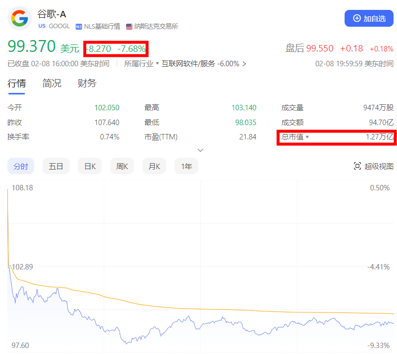 2月8日美股收盤,谷歌大跌7.68%,市值蒸發約1056億美元(約7172.78億元人民幣)。