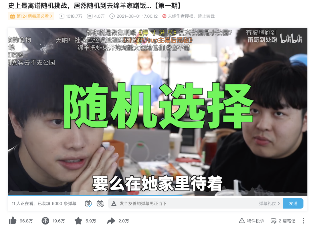 在此之後,兩人延續了這一期視頻中受歡迎的點。將原本的“隨機挑戰”固定成擁有特殊任務的“蹭飯挑戰”。觀眾們關注的點,也從發生多少“隨機”的事情,轉移到這一期視頻又會去見到哪一位新的UP主。