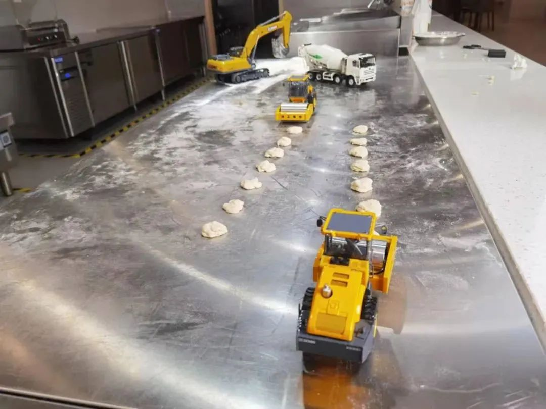 春節的時候,徐工用礦卡模型運來麪粉、混凝土攪拌車和麪、壓路機壓平面皮、裝載機忙着轉運、挖掘機開足馬力裝餡料、攤鋪機用來包餃子、起重機將餃子籠屜吊裝上灶。
