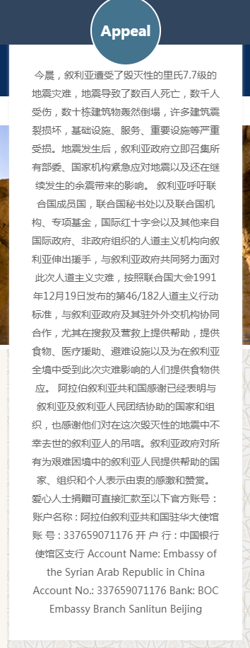 據紅星新聞報道,敍利亞駐華大使館已開放官方捐款通道。 2月8日,敍利亞駐華大使館的官網上,出現有關捐款賬户的中文文章在進行彈窗顯示。