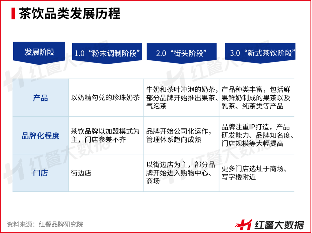 總體來看,我國現製茶飲品類已經發展相對成熟,主要經歷了三個發展階段,分別是以珍珠奶茶為主的1.0“粉末調製階段”,產品主打“茶葉+牛奶”的2.0“街頭階段”,以及以鮮果鮮奶為主的3.0“新式茶飲階段”。