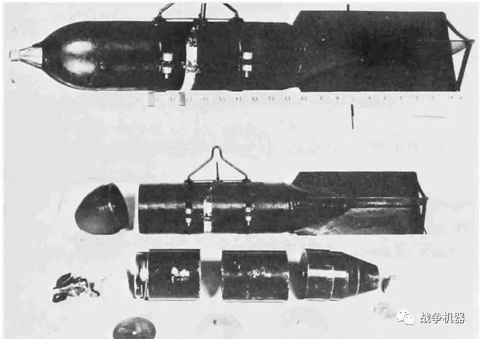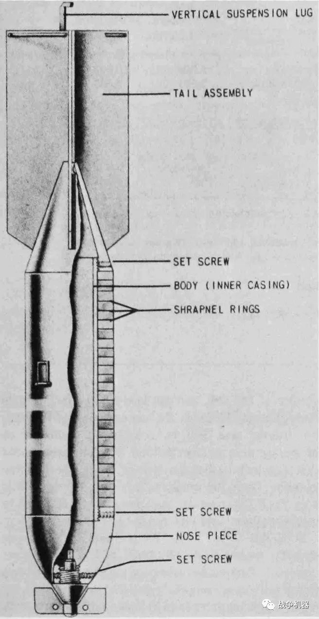 炸彈主體由一根縱向焊接的i/ginch厚的鋼管組成,並在前端由一個3.4英寸厚的鼻塞封閉,鼻塞被焊接到位。一個圓柱形的木塊部分安裝在彈體的後端,用六個沉頭木螺釘固定。該木塊包含了簡單的衝擊引信和彈簧式安全銷,同時也是機體和機尾之間的連接元件。在木塊上縱向鑽有兩個-英寸的通氣孔,相隔180°。保險絲長27英寸,直徑為l3/16英寸。一個管狀的鋁製主體包含一個觸發器和一個蠕變彈簧。一個實心螺紋塞子關閉了後端,一個裝有底火的塞子擰進了前端。一個帶彈簧的安全銷將發射器固定在原位。炸彈體內的燃燒物由第一火藥和主火藥組成,第一火藥緊靠底火,主火藥位於第一火藥下方。第一火藥是一種由鎂、過氧化鋇和硝酸鉀組成的壓縮黑火藥。主裝藥是熱劑。