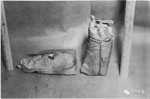 爆破裝置,顯示錫制容器和1公斤的紙包裝的苦味酸炸藥。側面和末端的孔是用來裝引信的。