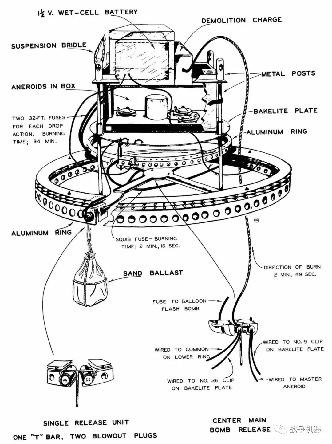 掛在日本氣球吊艙上的炸彈載荷和全部壓艙物。爆炸的炸藥塞釋放沙袋。循環往復,最後釋放出左邊的兩個燃燒彈和掛在中間的15公斤殺傷人員炸彈。