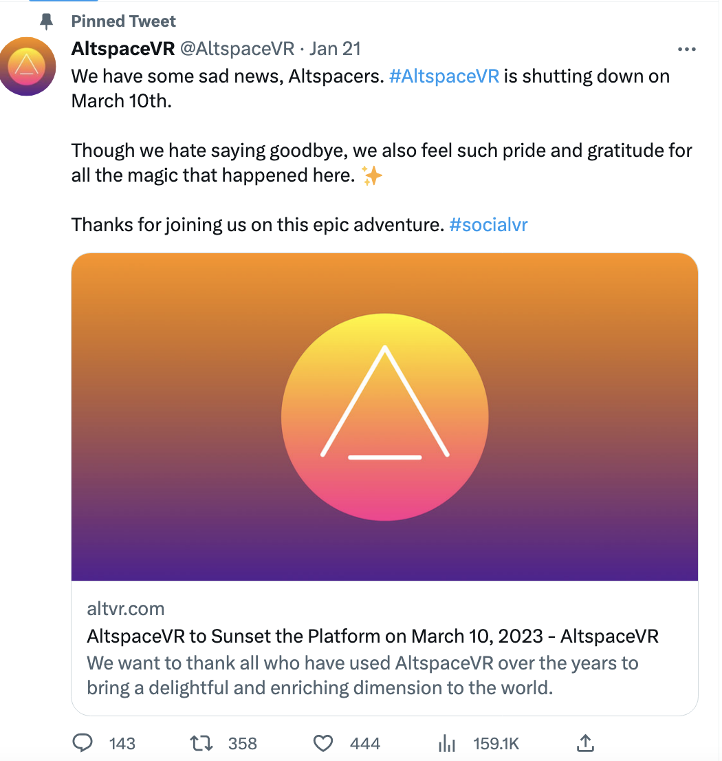 1月20日,微軟旗下的社交虛擬現實(VR)平台AltpaceVR宣佈,將於今年3月10日關停。AltspaceVR成立於2015年,是最早的社交虛擬現實平台之一,於2017年被微軟收購。