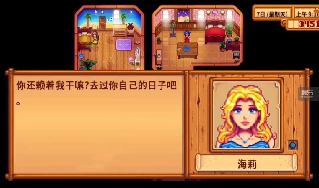 同樣是結束親密關係,《星露穀物語》設計了更真實的玩法。在《星露穀物語》中,玩家同樣可以選擇與配偶離婚,不過手續複雜很多。玩家需要到鎮長的屋中找到道具書,選擇離婚選項。提交申請後玩家可以反悔,但必須在當晚鎮長家關門前撤回申請。如果確定離婚,伴侶會在第二日搬離玩家,回到自己原先的住所。玩家自己的屋子裏會出現一個木箱,裏邊是玩家此前放在對方房間裏的東西。同時,二人好感度降為零,人物界面也會標明“前任”,如果玩家再與其互動,對方會作出不算友好的反應。