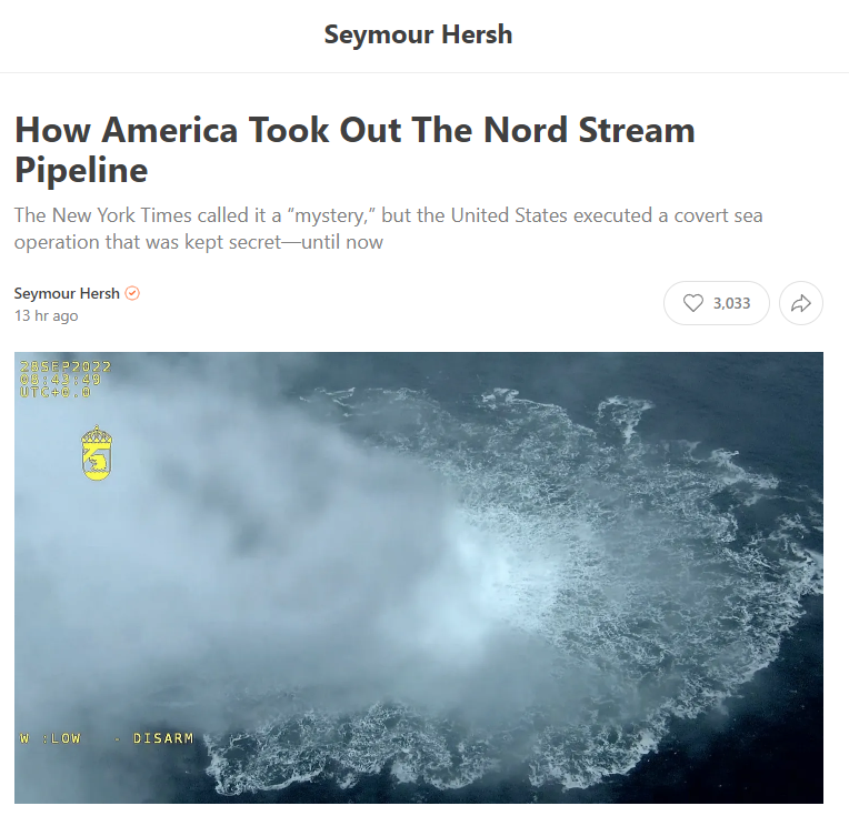 當地時間8日,這位美國資深調查記者、普利策獎得主在“substack”媒體平台上發佈調查文章,援引“直接瞭解內情的消息人士”爆料,詳細描述美國如何“密謀”摧毀北溪天然氣管道。