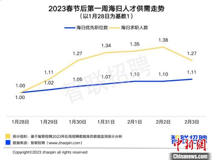 數據顯示,當前國內企業對海外人才的需求快速釋放,對海歸人才的需求呈上升趨勢。2023年春節後首周,海歸優先的職位數和在國內求職的海歸人數均呈上揚態勢,2月3日的海歸優先職位數比1月28日增長11%,海歸求職人數增長27%。