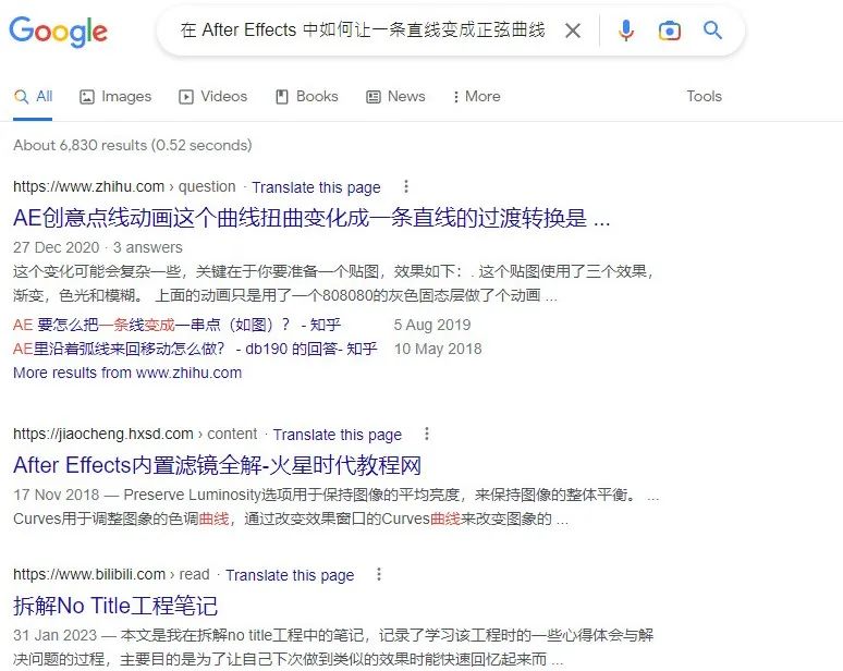 就像今天我們後期正在討論的怎麼畫“正弦曲線”,我直接搜索 “在 After Effects 中如何讓一條直線變成正弦曲線?”。