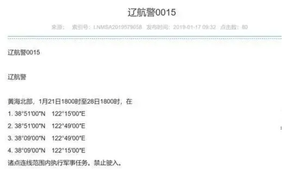 2月9號,大連海事局發佈了一則航行警告,稱13號0800時到17號1600時在黃海北部某海域進行實彈射擊,禁止駛入。