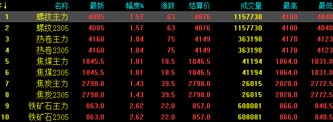 2月9日,黑色系期貨集體上漲,鐵礦領漲,漲幅2.62%。螺紋鋼主力漲63,收報4085,漲幅1.57%;成交方面,整體成交明顯增加,但也存在漲價後難出貨的情況,説明需求恢復依然緩慢。